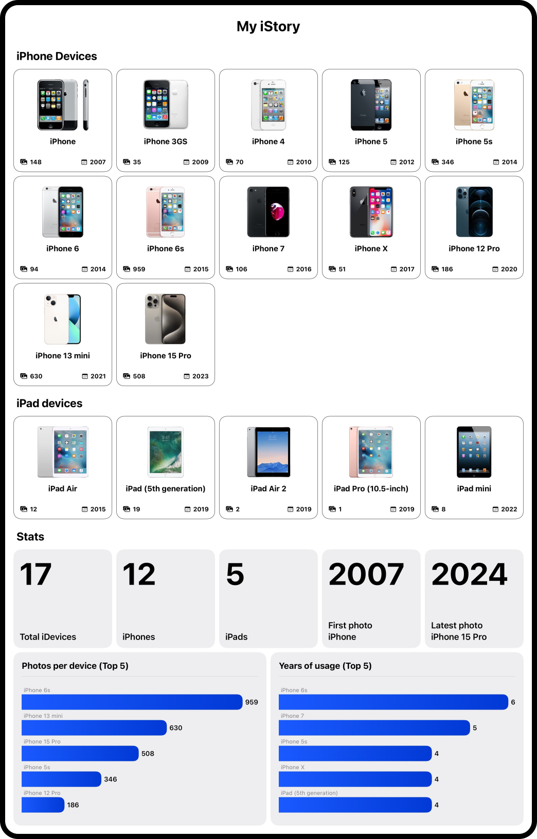 Delve into the numbers behind your digital history! iStory provides insightful statistics on the devices you've owned, and the photos taken over the years. Discover fascinating trends and patterns that highlight your tech and photographic preferences.đ€ Exportable Infographics: